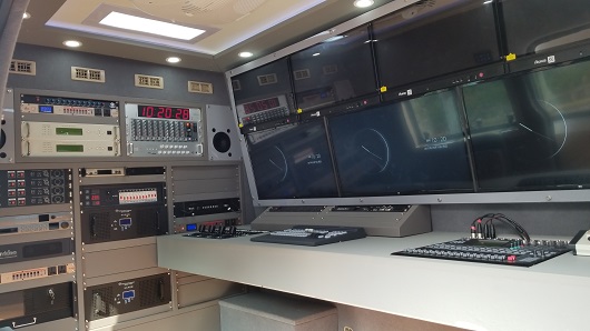 2、设备区:设备区主要由19标准支架、信号配线箱、工作台、2张折叠式坐椅、行车空调系统以及手摇升降天线杆组成。标准支架内含有系统设备及贯穿设备区与直播工作区之间的应急通道。信号配线箱含有各类信号配线架(电话线、网线、光纤、音频线、音箱线等)。设备区配置维修照明灯1盏(汽车电瓶供电),侧面配置市电、UPS电源插座各一只。
